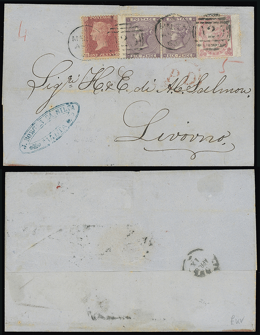 Malta: A25 Duplexes: Covers: 1863 (Apr. 25) wrapper to Livorno franked 1862 1d. plate 16, 3d. (wing margin) and pair 6d. (wing margin) tied by “A25” duplexes with oval red “P-D.” mark below and rated ‘4’ at top
