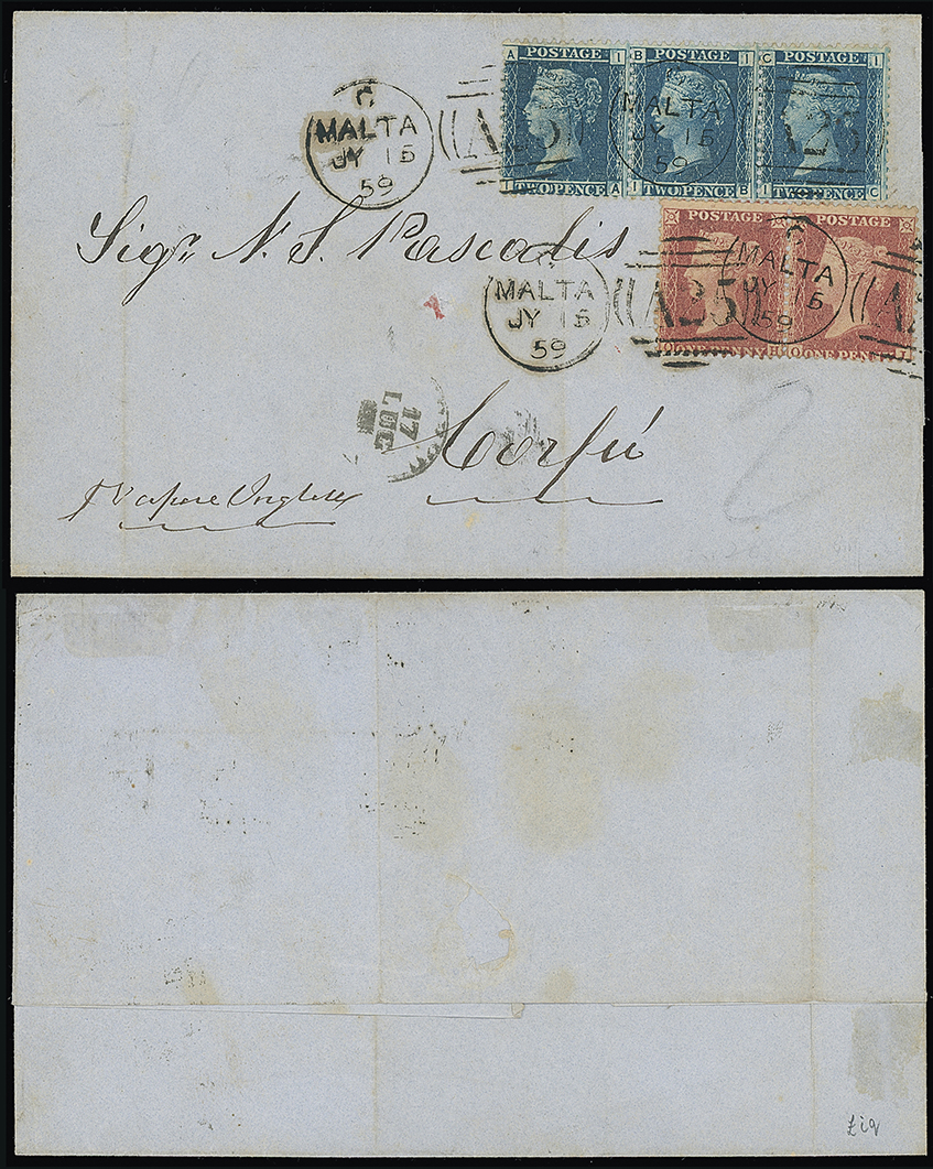 Malta: A25 Duplexes: Covers: 1859 (July 15) wrapper “p Vapore Inglese” to Corfu franked 1d. red pair and 2d. strip of three tied by four “A25” duplexes with part Corfu arrival c.d.s. Ex Francisco. Photo. (Image1)