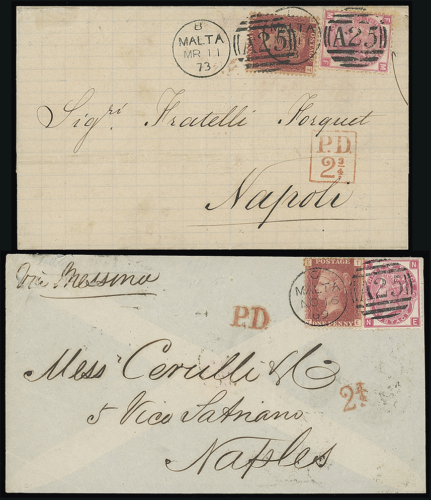 695 c, entire, etc. imageMalta: A25 Duplexes: Covers: 1869 (Nov. 16) envelope and 1873 (Mar. 11) wrapper to Naples both franked 1d. and 3d. and tied by “A25” duplex with red “23/4” and “P.D.” marks or red framed “PD/23/4” accountancy marks. Syracus and Naples datestamps on the reverse. (2 items) (Image1)