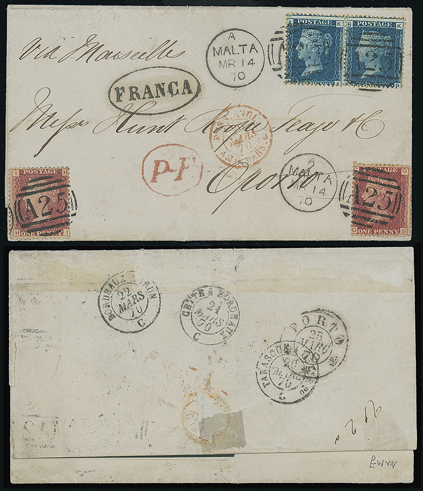 699 c, entire, etc. imageMalta: A25 Duplexes: Covers: 1870 (Feb. 18) entire letter “via Marseilles” to Oporto franked 1858-79 1d. (2, plates 83 and 125) 2d. pair plate 13 tied by “A25” duplexes with oval “FRANCA”, Marseille transit c.d.s. and oval “P-F” mark in red applied in error as no further charges due. French T.P.O. and Oporto datestamps on the reverse, attractive franking. Photo. (Image1)