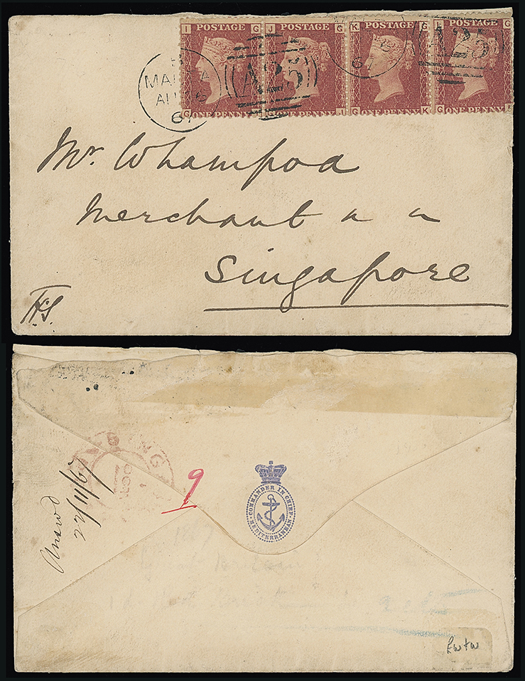 681 c, entire, etc. imageMalta: A25 Duplexes: Covers: 1867 (Aug. 26) envelope (rear flap with insignia of Lord Clarence Paget, Naval Commander in Chief in the Mediterranean) to Singapore franked 1864 1d. strip of four plate 79 tied by two “A25” duplexes and with Singapore arrival c.d.s. in red on the reverse. Very rare destination, fine. Photo. (Image1)