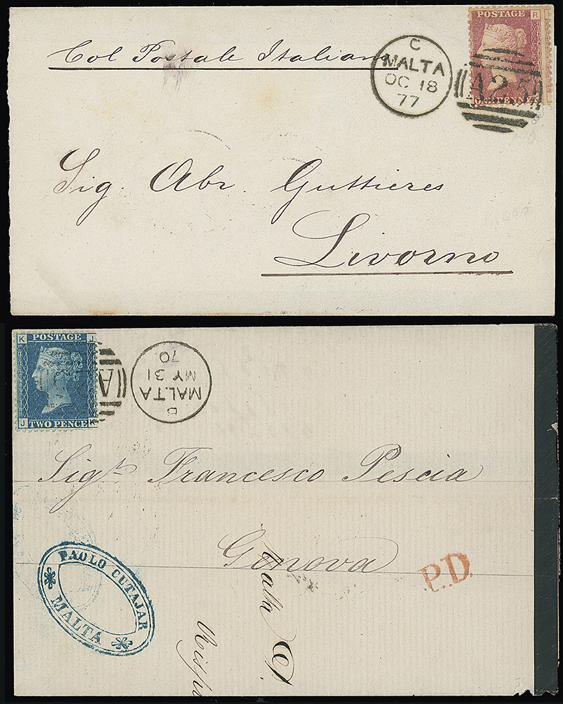 700 c, entire, etc. imageMalta: A25 Duplexes: Covers: 1870 (May 31) and 1877 (Oct. 18) wrappers to Genoa or Livorno franked 2d. plate 13 or 1d. plate 190 tied by “A25” duplexes for the pre and post U.P.U. printed matters rates, the former with red “P.D.” mark, scarce and attractive pair. (2 items) Photo. (Image1)