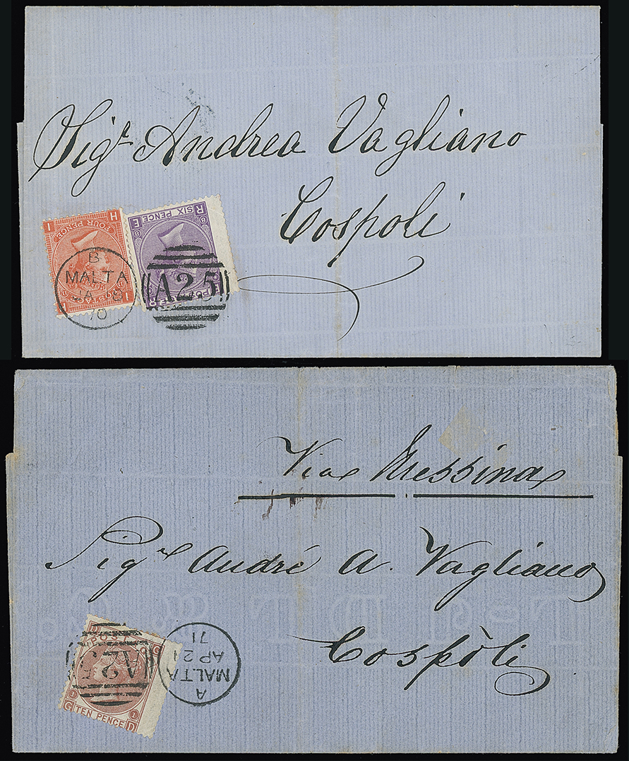 696 c, entire, etc. imageMalta: A25 Duplexes: Covers: 1870 (Jan. 18) and 1871 (Apr. 21) double weight entire letters to Constantinople franked 1869 4d. plate 12 and 6d. plate 8 or 10d. plate 1 (wing margin) tied by “A25” duplexes. British P.O. in Constantinople arrival c.d.s. on the reverse, fine and attractive, the latter ex Francisco. (2 items) Photo. (Image1)