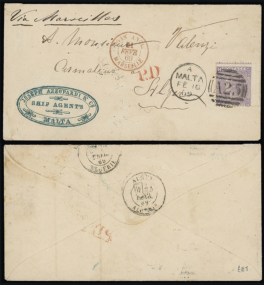 686 c, entire, etc. imageMalta: A25 Duplexes: Covers: 1869 (Feb. 10) envelope (shipping agents’ cachet at lower left) “via Marseilles” to Algiers franked 1867 6d. plate 6 tied by “A25” duplex with “P.D.” mark in red and Marseille transit c.d.s. Algiers arrival c.d.s. on the reverse and a rather uncommon destination. Photo. (Image1)