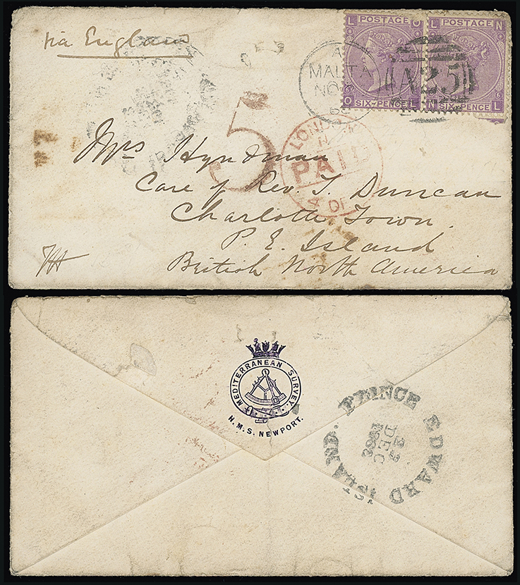 684 c, entire, etc. imageMalta: A25 Duplexes: Covers: 1868 (Nov. 25) envelope “via England” (rear flap with HMS Newport insignia) to Prince Edward Island franked 1867 6d. pair (one with surface abrasion other with pre-printing crease) tied by “A25” duplex with London Paid transit c.d.s. and “5”(d) credit mark to Canada in red below. Carried on the Inman/Allan Line “City of Cork” to Halifax, rail to Pictou and ferry to Charlotte Town, very rare destination. Photo. (Image1)
