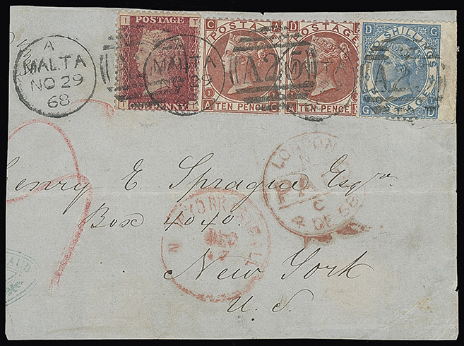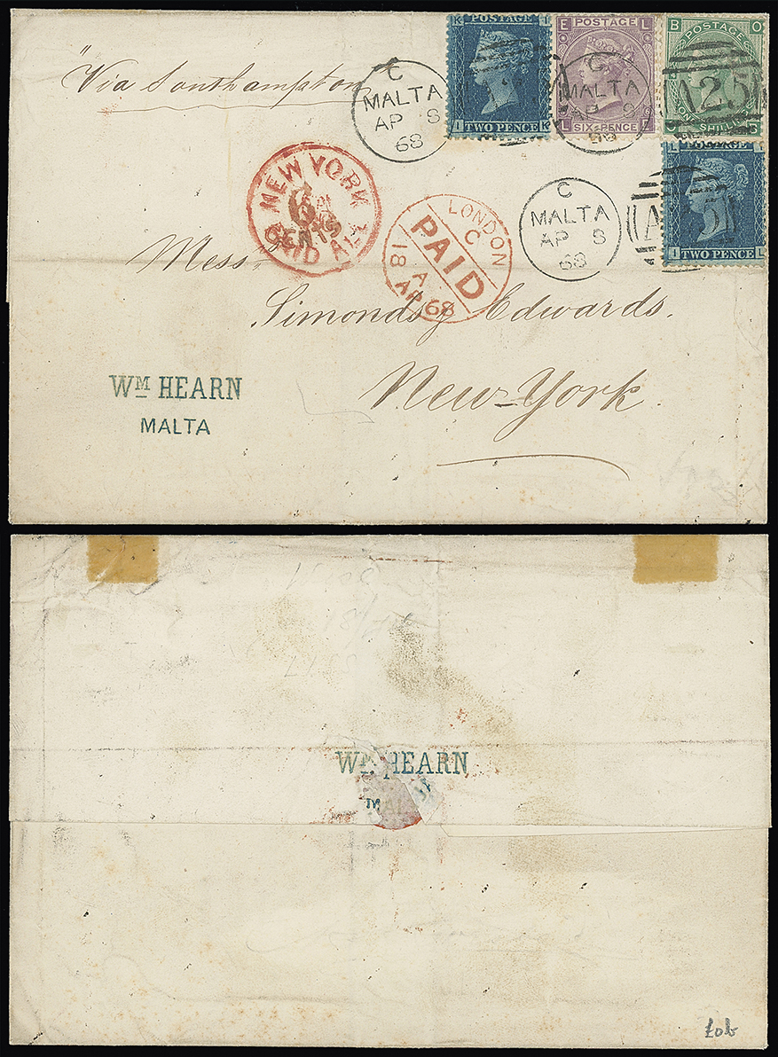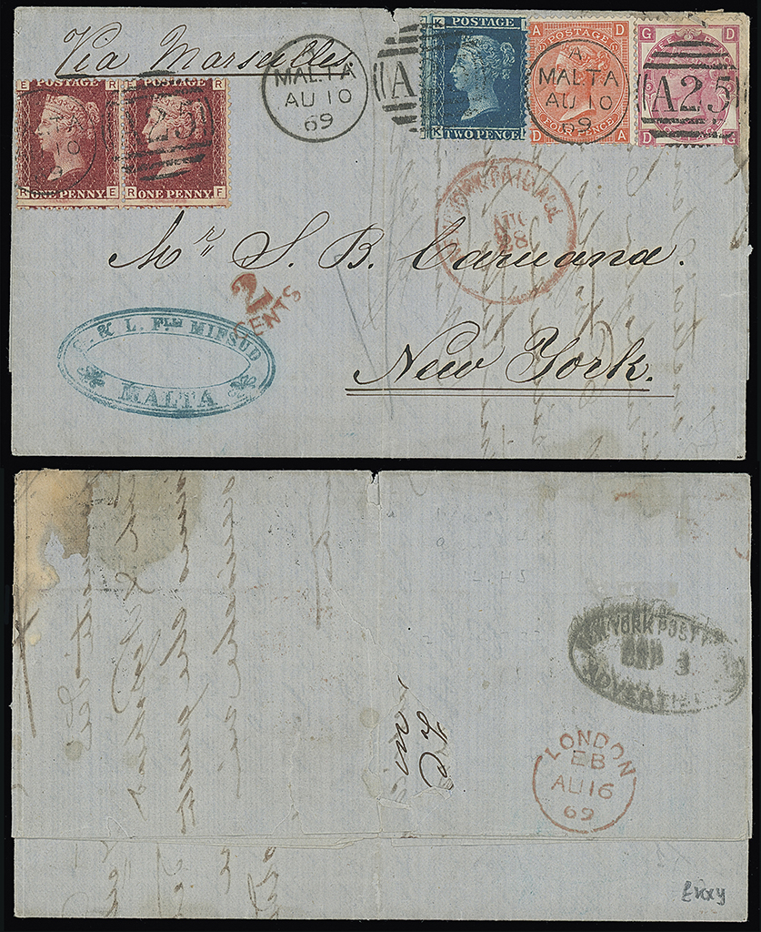 691 c, entire, etc. imageMalta: A25 Duplexes: Covers: 1869 (Aug. 10) entire letter “via Marseilles” to New York franked 1858-79 1d. pair plate 125, 1858 2d. 1868 3d. plate 5 and 1869 4d. plate 11 all tied by three “A25” duplexes, with New York Paid All datestamp and “2/CENTS” accountancy credit mark and London transit and “NEW YORK POST OFFICE/ADVERTISED” datestamp on the reverse, attractive and remarkable four colour franking. Photo. (Image1)