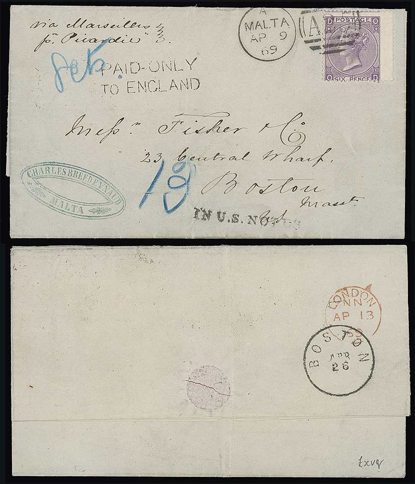 689 c, entire, etc. imageMalta: A25 Duplexes: Covers: 1869 (Apr. 8) entire letter “via Marseilles/p Picardie” to Boston franked 1869 6d. plate 8 tied by “A25” duplex, with underpayment recognised and with “PAID-ONLY/TO ENGLAND” with “8cts” noted alongside and with “13”(cents) alongside “IN U.S. NOTES” mark. London transit and Boston datestamps on the reverse, scarce example of underpaid mail. Ex Orme and Eastgate. Photo. (Image1)