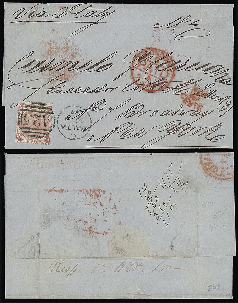 693 c, entire, etc. imageMalta: A25 Duplexes: Covers: 1869 (Sept. 1) entire letter “via Italy” to New York franked 1867 10d. plate 1 tied by “A25” duplex, with London transit, “2/CENTS” accountancy credit mark in red and part New York Paid all datestamp on the reverse. Ex Coates. Photo. (Image1)