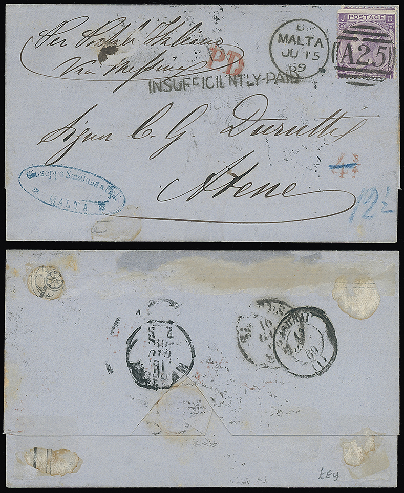 690 c, entire, etc. imageMalta: A25 Duplexes: Covers: 1869 (July 15) entire letter “per Postali Italiano/via Messina” to Athens franked 1867 6d. plate 8 tied by “A25” duplexes, with “P.D.” mark in red apparently applied in error and with “INSUFFICIENTLY-PAID” mark directly below, “43/4” accountancy mark in red deleted and with manuscript “121/2”(cents) (11/4d.) credit to Malta. Syracuse, Messina and Athens datestamps on the reverse, very unusual. Photo. (Image1)
