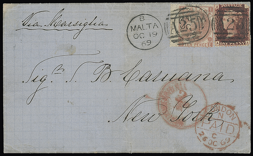 694 c, entire, etc. imageMalta: A25 Duplexes: Covers: 1869 (Oct. 19) entire letter “via Marsiglia” to New York franked 1858 1d. plate 125 and 1867 10d. plate 1 (wing margin) tied by “A25” duplexes with London Paid and New York Paid All datestamps in red and with “2” cents credit mark to U.S.A., uncommon via Marseille rate. Photo. (Image1)