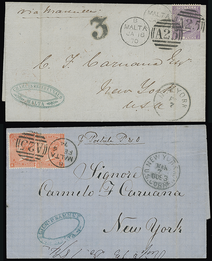 697 c, entire, etc. imageMalta: A25 Duplexes: Covers: 1870 (Jan. 18) wrapper (file folds) “via Marseilles” to New York franked 1869 6d. plate 8, underpaid for the Marseille route and with bold “3” (cents) mark in black, possibly a charge raised and New York c.d.s. at lower right and 1874 (Feb. 6) entire letter “p Postale P & O” to New York franked 1872 4d. vermilion plate 13 (2) tied by “A25” duplex with New York “DUE 3” datestamps. (2 items) Photo. (Image1)