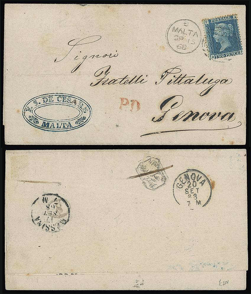 687 c, entire, etc. imageMalta: A25 Duplexes: Covers: 1869 (Mar. 19) entire letter to Rome franked 6d. plates 6 tied by “A25” duplex with scarce “43/4” accountancy and “P.D.” marks in red and the reverse with Syracuse and Naples transit datestamps, fine. Photo. (Image1)
