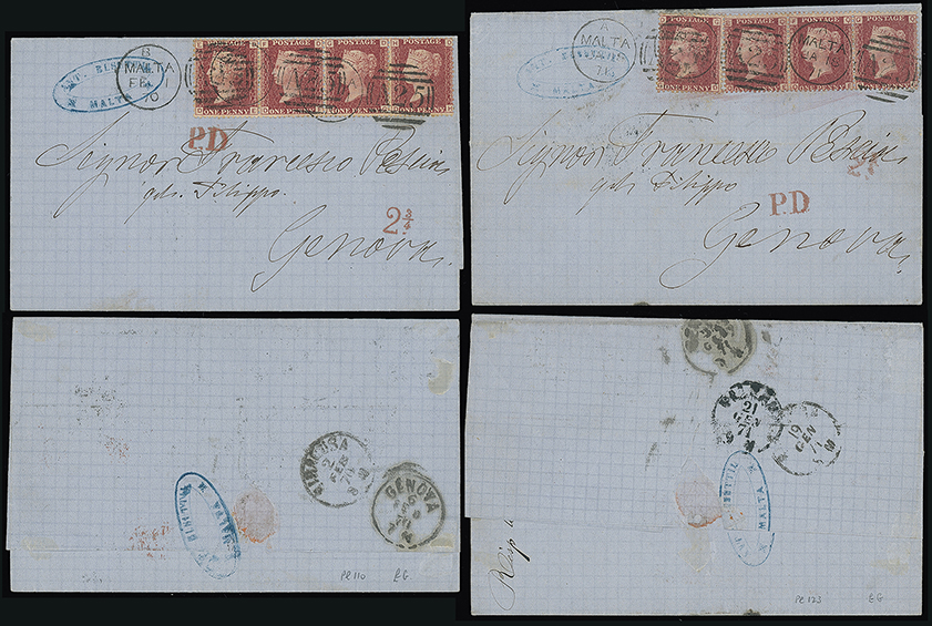 698 c, entire, etc. imageMalta: A25 Duplexes: Covers: 1870 (Feb. 1) and 1871 (Jan. 18) wrappers to the same addressee in Genoa both franked 1858 1d. strips of four plates 110 or 123 tied by “A25” duplexes, each with “P.D.” marks and “23/4” accountancy marks in red, fine. (2 items) Photo. (Image1)