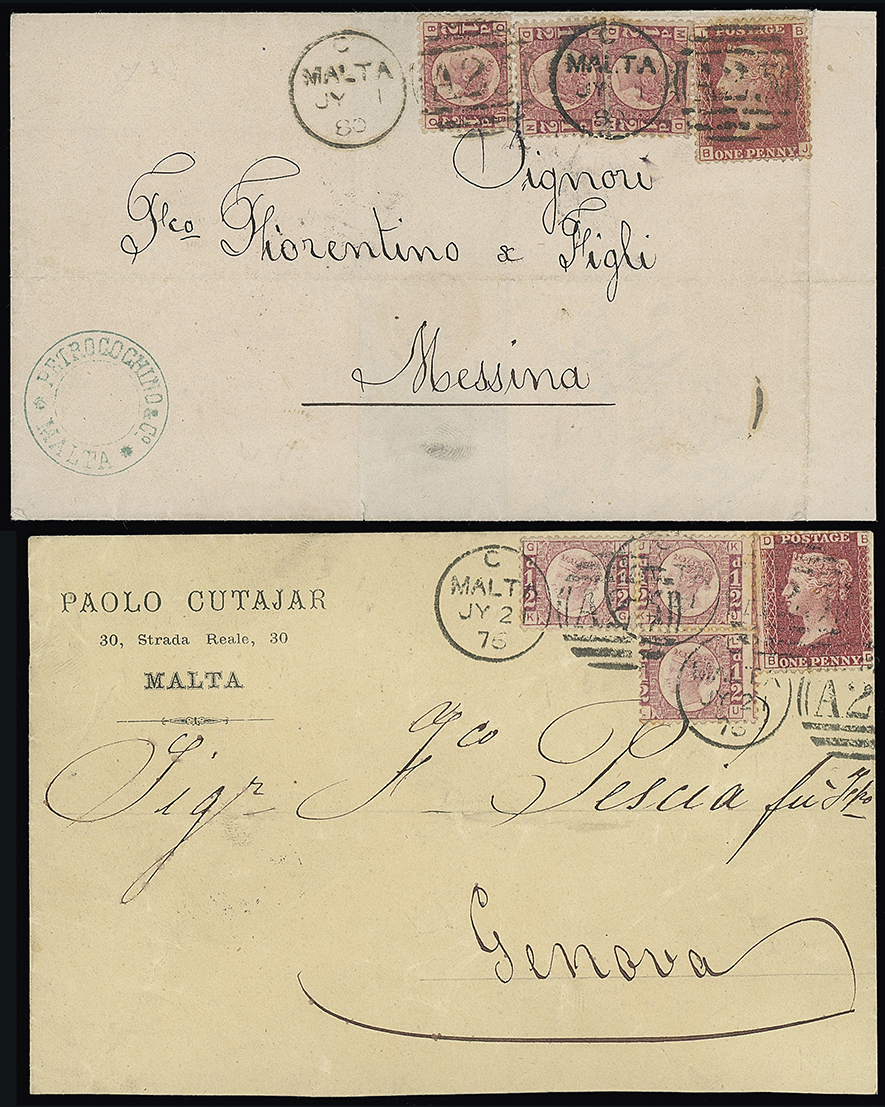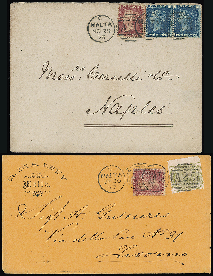728 c, entire, etc. imageMalta: A25 Duplexes: Covers: 1877 (July 30) envelope to Livorno franked 1858 1d. plate 179 and 1877 4d. sage-green and 1878 (Nov. 28) envelope to Naples franked 1876 1d. plate 194 and 1876 2d. pair plate 15 tied by “A25” duplexes, attractive double weight frankings. (2 items) Photo. (Image1)