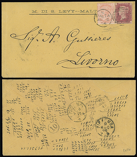 721 c, entire, etc. imageMalta: A25 Duplexes: Covers: 1876 (July 4) envelope to Livorno franked 1870 1/2d. plate 10 and 1858 1d. rose-red plate 161 pair and 1877 wrapper to Messina franked 1870 1/2d. plate 10 and 1858 1d. rose-red plate 196 pair, all tied by “A25” duplexes. (2 items) Photo. (Image1)