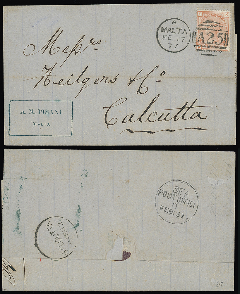 725 c, entire, etc. imageMalta: A25 Duplexes: Covers: 1877 (Feb. 17) wrapper to Calcutta 1876 4d. plate 15 tied by “A25” duplex, with Sea Post Office (Bombay) and Calcutta arrival datestamps on the reverse. Uncommon destination, fine. Photo. (Image1)
