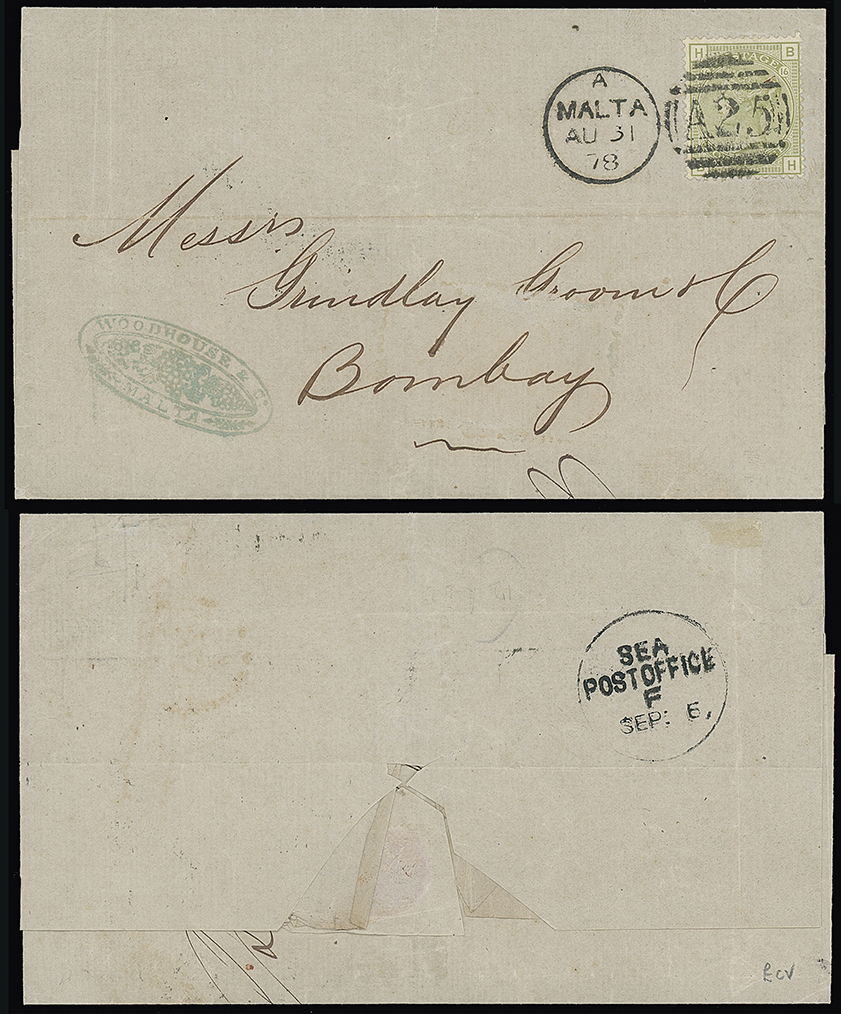 729 c, entire, etc. imageMalta: A25 Duplexes: Covers: 1878 (Aug. 31) wrapper to Bombay franked 1876 4d. plate 16 tied by “A25” duplex, with Sea Post Office (Bombay) arrival datestamps on the reverse. Uncommon destination, fine. Photo. (Image1)