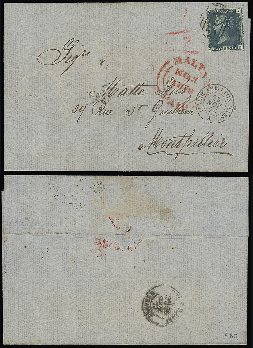 730 c, entire, etc. imageMalta: A25 Duplexes: Covers: 1878 (Nov. 11) wrapper to France franked 1858 2d. plate 16 tied by “A25” cancellation with manuscript ‘1/2’(d) additional cash payment alongside with “MALTA/PAID” double arc datestamp below and Lyon-Marseilles T.P.O. datestamp. Montpellier arrival datestamp on the reverse. Rare example of cash and franking combination, very fine. Photo. (Image1)