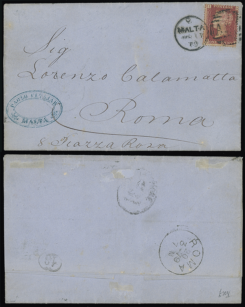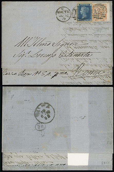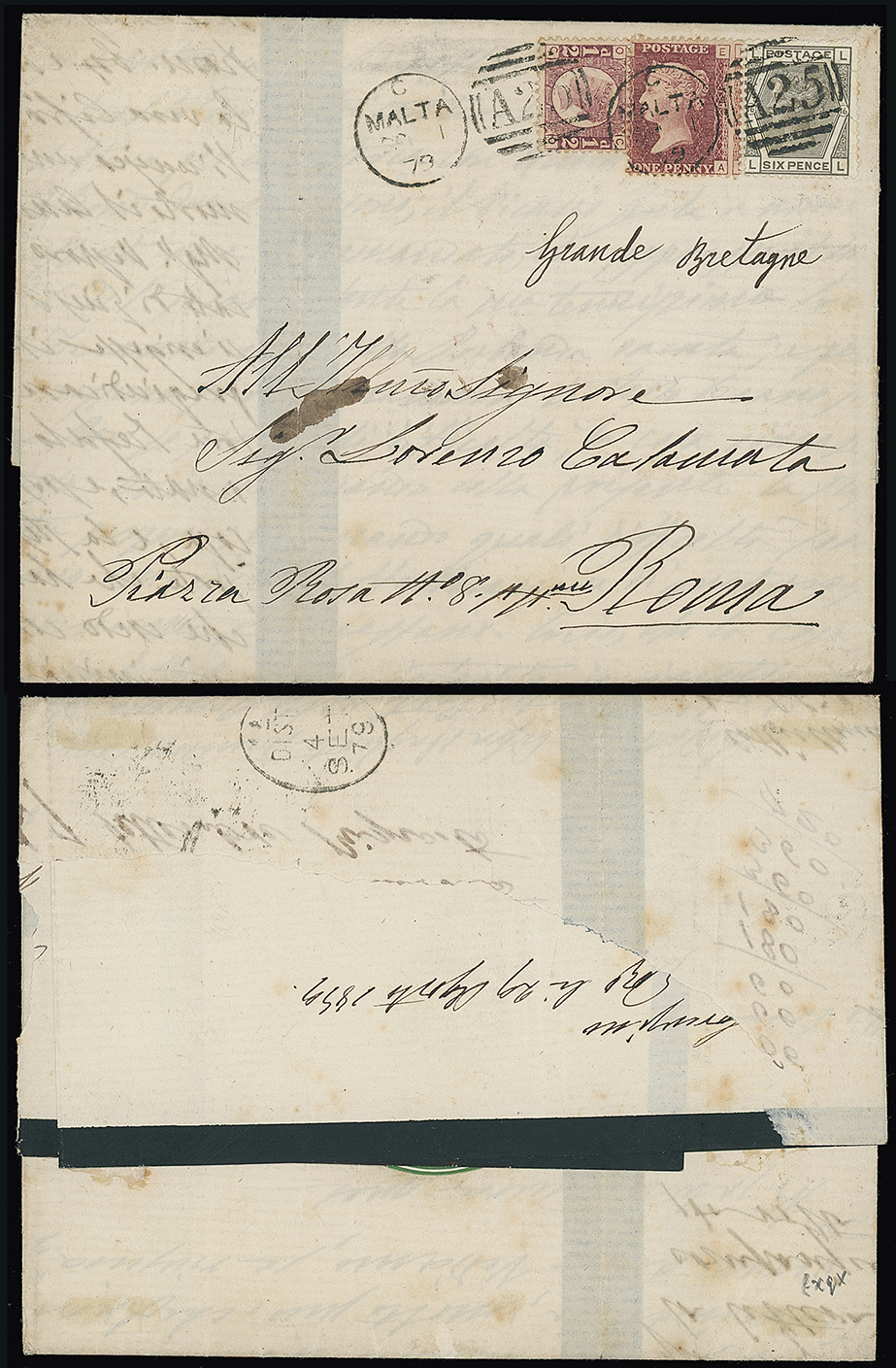 734 c, entire, etc. imageMalta: A25 Duplexes: Covers: 1879 (Sept. 1) entire letter (reinforced split) to Rome franked 1870 1/2d. plate 13, 1864 1d. rose-red plate 191 and 1873 6d. grey plate 16 tied by “A25” duplexes, with Rome arrival c.d.s. on the reverse, uncommon triple rate. Photo. (Image1)