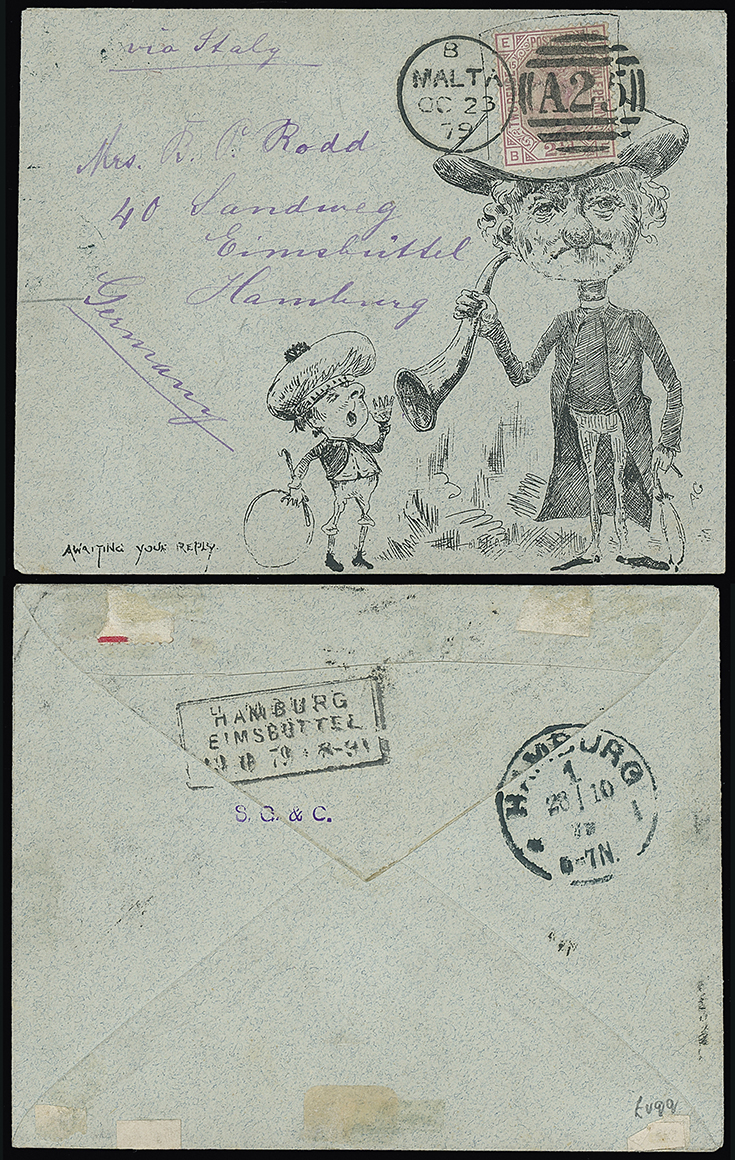 736 c, entire, etc. imageMalta: A25 Duplexes: Covers: 1879 (Oct. 16) printed caricature envelope endorsed “AWAITING YOUR REPLY” at lower left, “via Italy” to Hamburg franked 1876 2½d. plate 15 tied by “A25” duplex with arrival c.d.s. on reverse. An early and unusual illustrated envelope. Photo. (Image1)