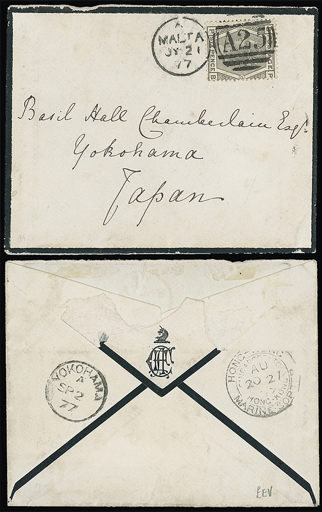 727 c, entire, etc. imageMalta: A25 Duplexes: Covers: 1877 (July 21) mourning envelope addressed to Basil Hall Chamberlain in Yokohama franked 1874 6d. plate 15 tied by “A25” duplex and representing the single rate, with double ring Hong Kong Marine Sorter (Hong Kong to Singapore) and Yokohama arrival c.d.s. on the reverse, a scarce destination, fine. Ex Mackenzie Smith. Pioneering Japanologist Basil Hall Chamberlain (1850-1935) produced some of the earliest translations of haiku into English and is perhaps best remembered for his informal and popular one-volume encyclopedia “Things Japanese”, which first appeared in 1890. Photo. (Image1)