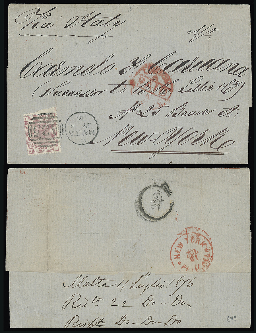 722 c, entire, etc. imageMalta: A25 Duplexes: Covers: 1876 (July 4) entire letter “via Italy” to New York franked 1876 21/2d. rosy mauve plate 3 tied by “A25” duplex with and London Paid transit and New York Paid All c.d.s’s on the reverse. Photo. (Image1)