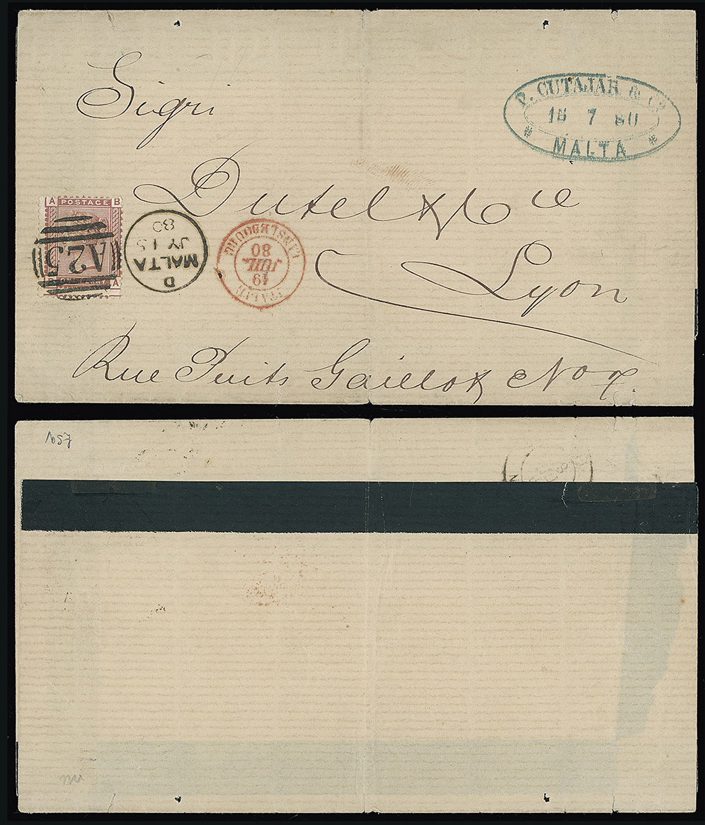 740 c, entire, etc. imageMalta: A25 Duplexes: Covers: 1880 (July 15) large wrapper to Lyon franked 1880 1d. Venetian red tied by “A25” duplexes with Lyon arrival c.d.s. on the reverse, uncommon printed matter mail and a scarce solo franking used in Malta. Photo. (Image1)