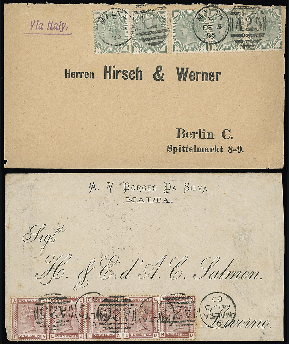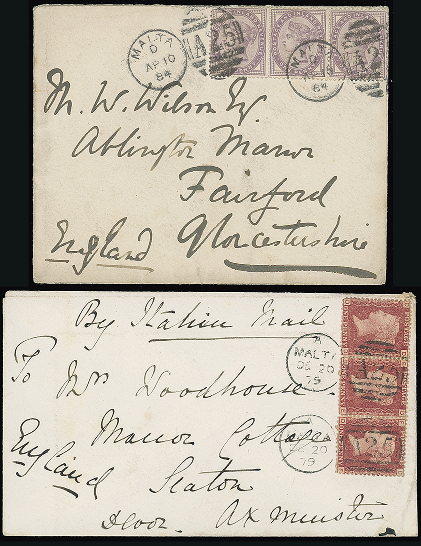 737 c, entire, etc. imageMalta: A25 Duplexes: Covers: 1879 (Dec. 20) envelope to England franked 1858 1d. plate 206 strip of three and 1884 (Apr. 10) envelope to England franked 1881 1d. lilac strip of three, both overpaid 1/2d. for the U.P.U. rates and tied by “A25” duplexes, fine. (2 items) Photo. (Image1)
