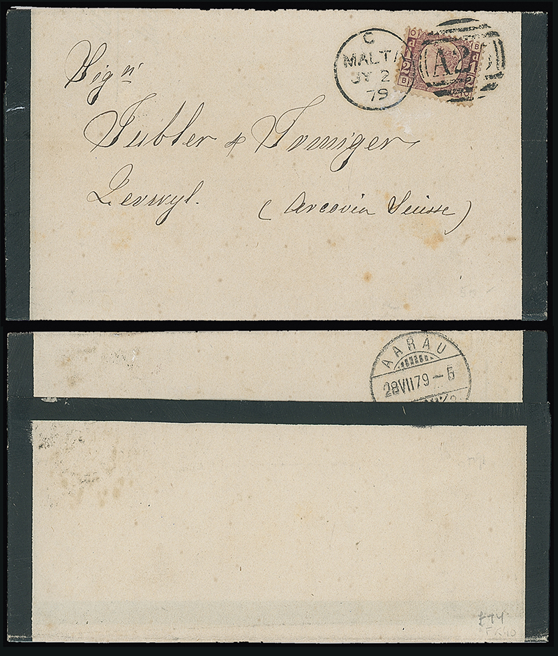 733 c, entire, etc. imageMalta: A25 Duplexes: Covers: 1879 (Aug. 23) mourning wrapper to Switzerland franked 1870 1/2d. plate 12 tied by “A25” duplex and with Aarrau arrival c.d.s. on the reverse, scarce solo franking. Photo. (Image1)