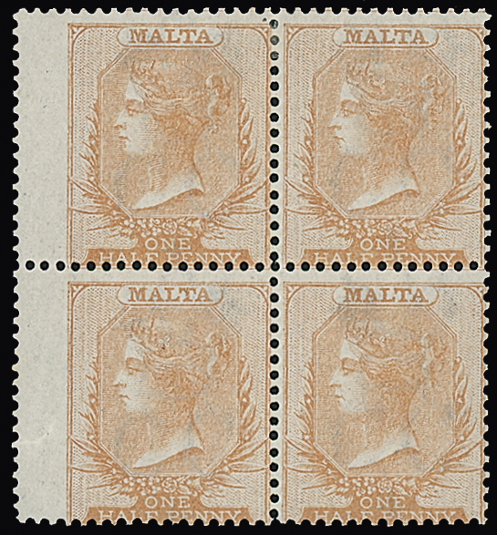 Malta: Issued Stamps: Queen Victoria: 1863-81 Watermark Crown CC, perf. 14 1/2d. brown-red ninth printing, in a fine mint block of four with wing margin at left. Photo. (Image1)