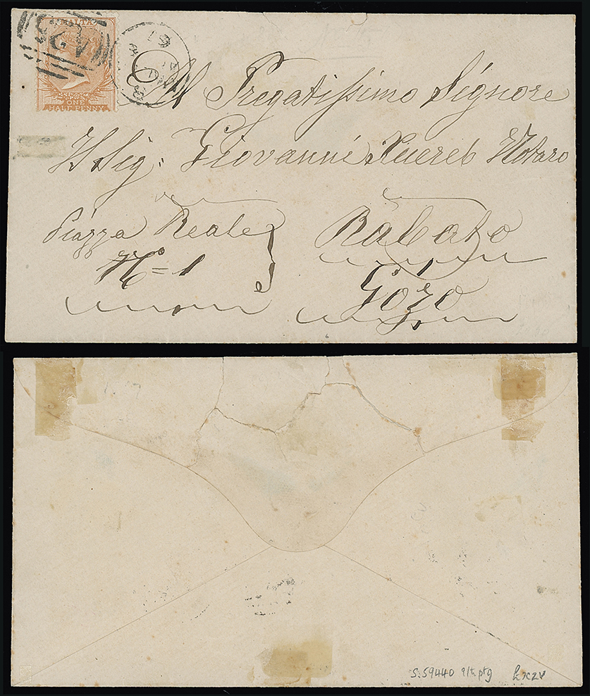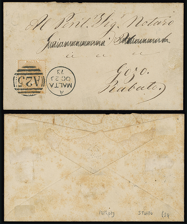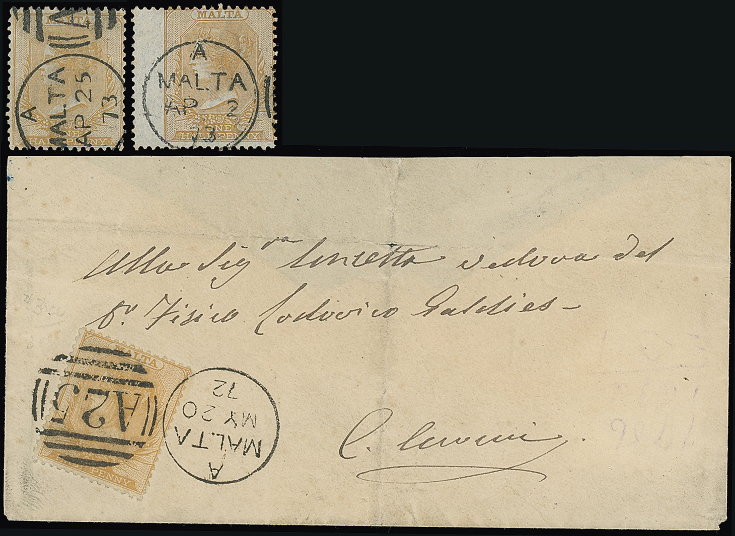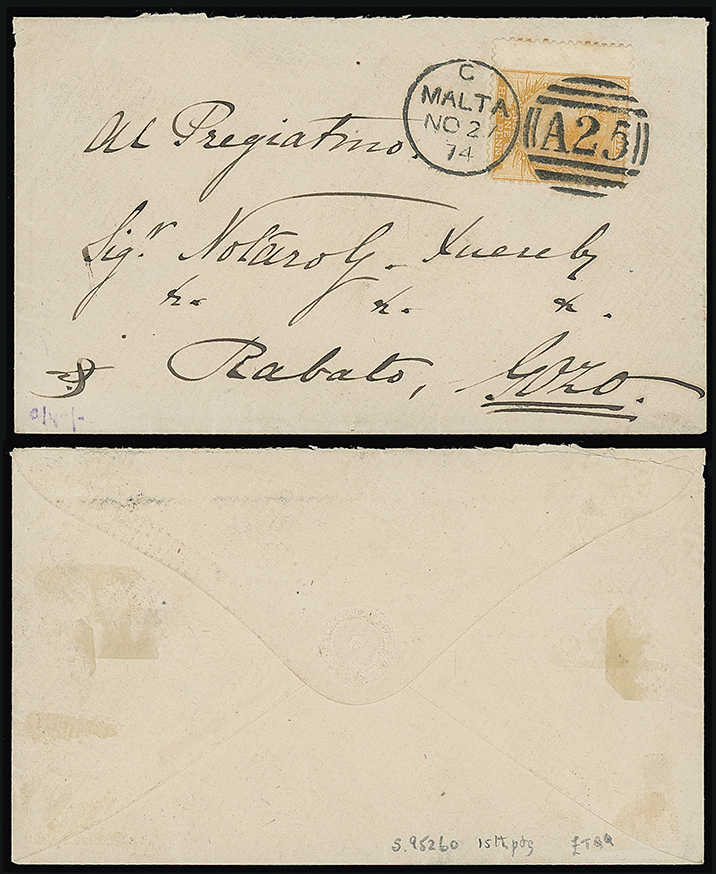 Malta: Issued Stamps: Queen Victoria: 1863-81 Watermark Crown CC, perf. 14 1/2d. pale orange-yellow buff fourteenth printing, fine used on 1873 (Oct. 23) to Gozo, tied by “A25” duplex. Photo. (Image1)