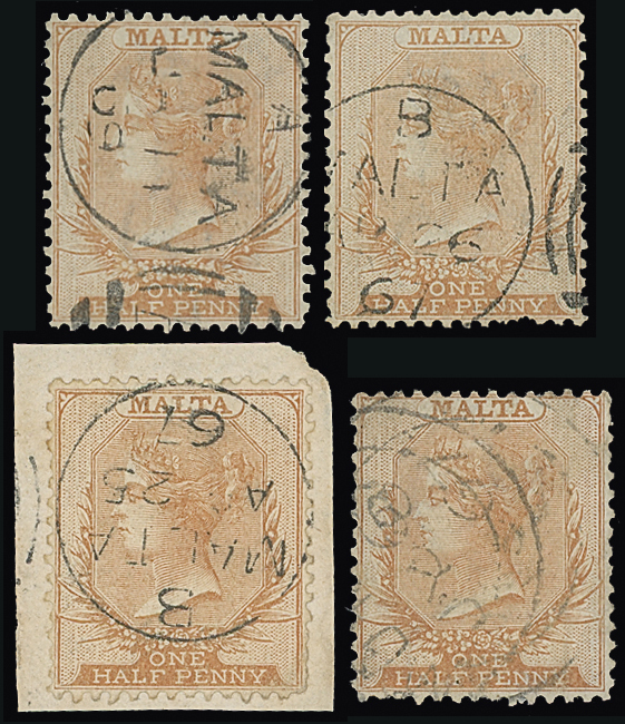 Malta: Issued Stamps: Queen Victoria: 1863-81 Watermark Crown CC, perf. 14 1/2d. brown-red ninth printing, four used examples, mainly fine. (Image1)
