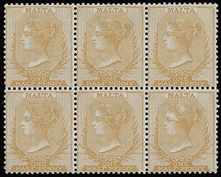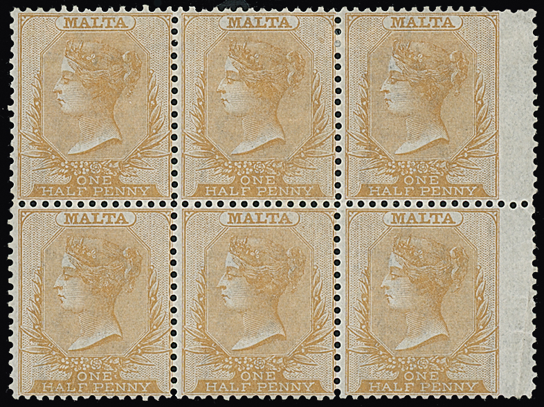 Malta: Issued Stamps: Queen Victoria: 1863-81 Watermark Crown CC, perf. 14 1/2d. dull orange buff eleventh printing, in a fine mint block of six (3 x 2) with wing margin at right. Photo. (Image1)