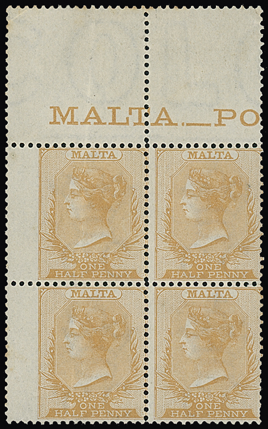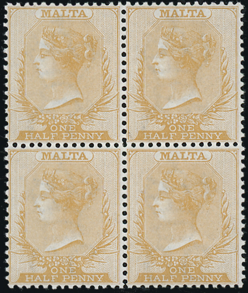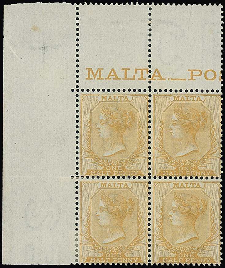 Malta: Issued Stamps: Queen Victoria: 1863-81 Watermark Crown CC, perf. 14 1/2d. golden yellow (aniline) fifteenth printing, in a fine and fresh mint block of four from the upper left corner of the pane, rare. Ex