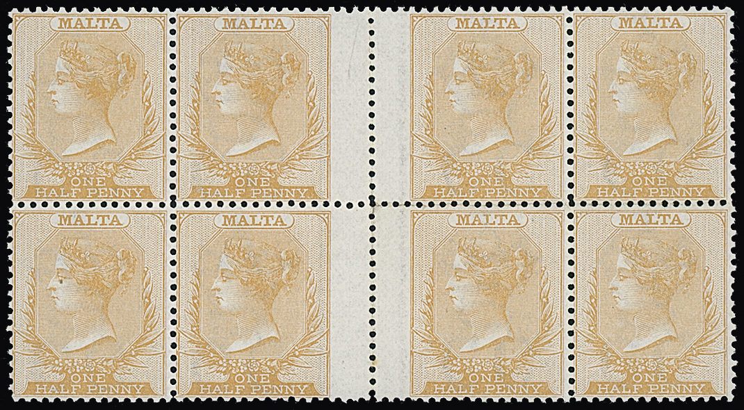 Malta: Issued Stamps: Queen Victoria: 1863-81 Watermark Crown CC, perf. 14 1/2d. pale orange-yellow buff fourteenth printing, in a mint interpanneau block of eight (4 x 2), fine. Ex Lawson. Photo. (Image1)