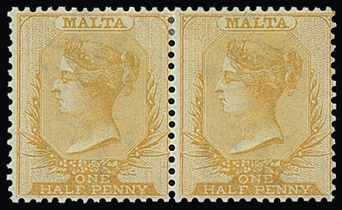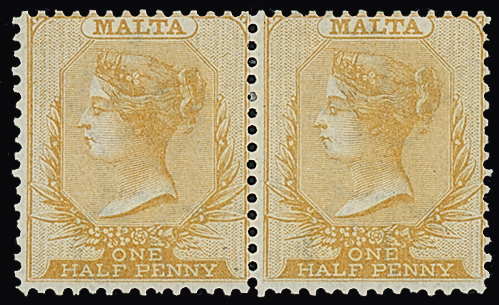 Malta: Issued Stamps: Queen Victoria: 1863-81 Watermark Crown CC, perf. 14 1/2d. golden yellow (aniline) fifteenth printing, in a fine mint horizontal pair. Photo. (Image1)