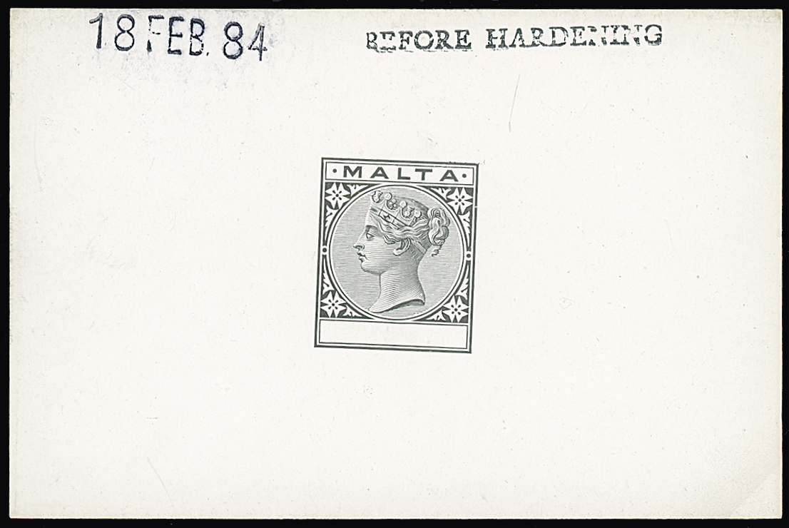 918 imageMalta: Issued Stamps: Queen Victoria: 1885-90, Proofs, Master die proof for the 2d., 4d. and 1s. values with blank value tablet, printed in black on glazed card (92 x 60mm), dated “18. FEB. 84” and marked “BEFORE HARDENING”, fine. Photo. (Image1)