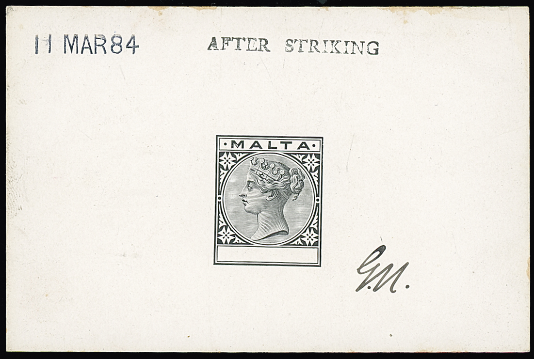919 imageMalta: Issued Stamps: Queen Victoria: 1885-90, Proofs, Master die proof for the 2d., 4d. and 1s. values with blank value tablet, printed in black on glazed card (92 x 60mm), dated “18. FEB. 84” and marked “AFTER HARDENING” with ink initials, fine. Photo. (Image1)