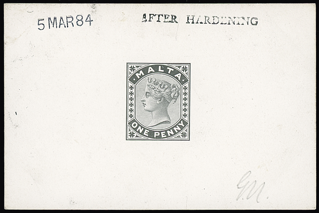 920 imageMalta: Issued Stamps: Queen Victoria: 1885-90, Proofs, 1d. die proof in black on glazed card (92 x 60mm), dated “5 MAR 84” and marked “AFTER HARDENING”, small thin, otherwise fine. Photo. (Image1)