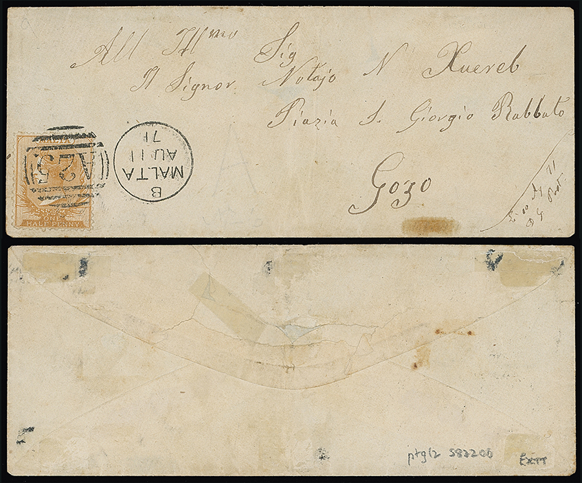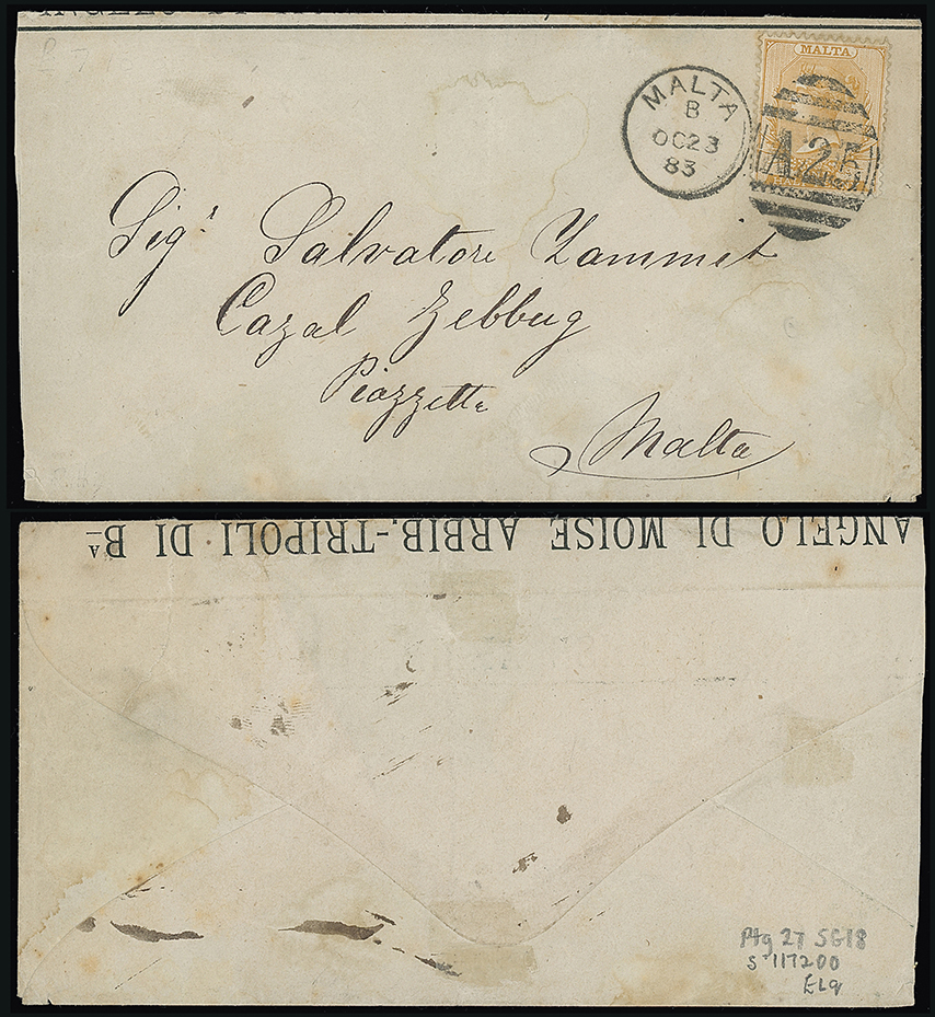 912 c, entire, etc. imageMalta: Issued Stamps: Queen Victoria: 1882-84 Watermark Crown CA perf. 14 1/2d. orange-yellow, twenty-seventh printing, used on 1883 (Oct. 23) cover to Zebbug, tied by “A25” duplex. Envelope of “Angelo di Moise Arbib-Tripoli”, most probably carried by hand from Tripoli and posted in Malta. Ex Clough. Photo. (Image1)