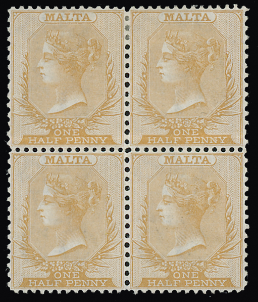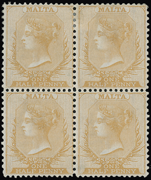 903 nh bl imageMalta: Issued Stamps: Queen Victoria: 1863-81 Watermark Crown CC, perf. 14 x 121/2 1/2d. yellow-buff, twentieth printing, in an unused block of four, large part original gum, some marks on gum otherwise fine. Photo. (Image1)