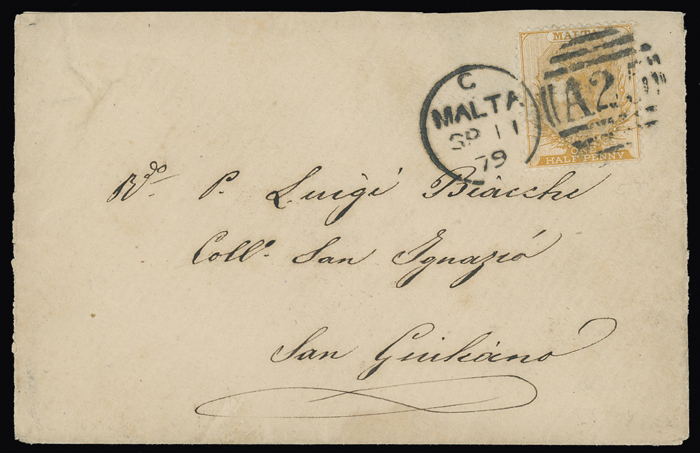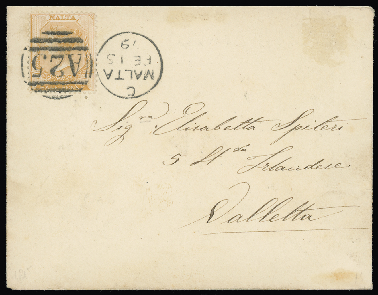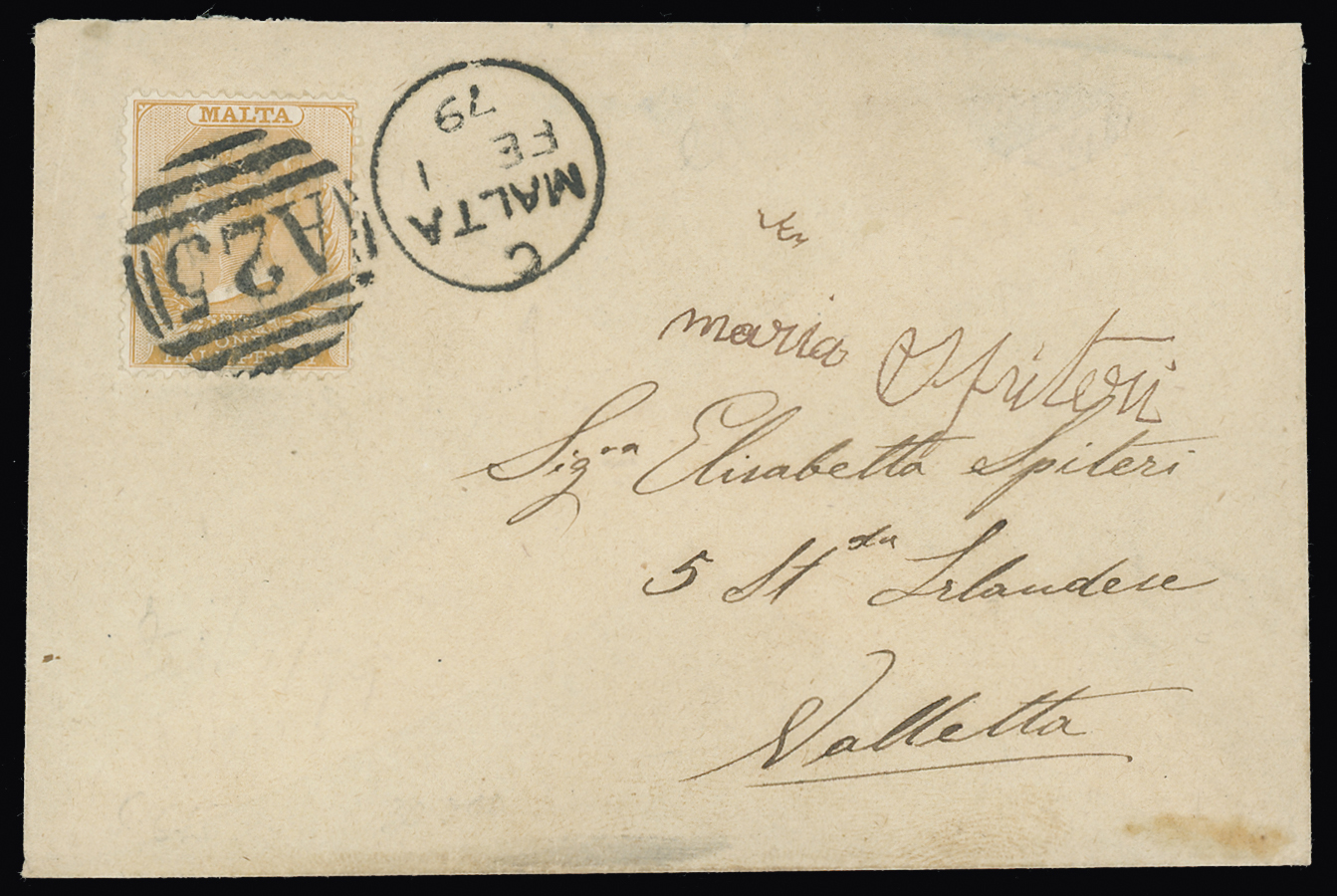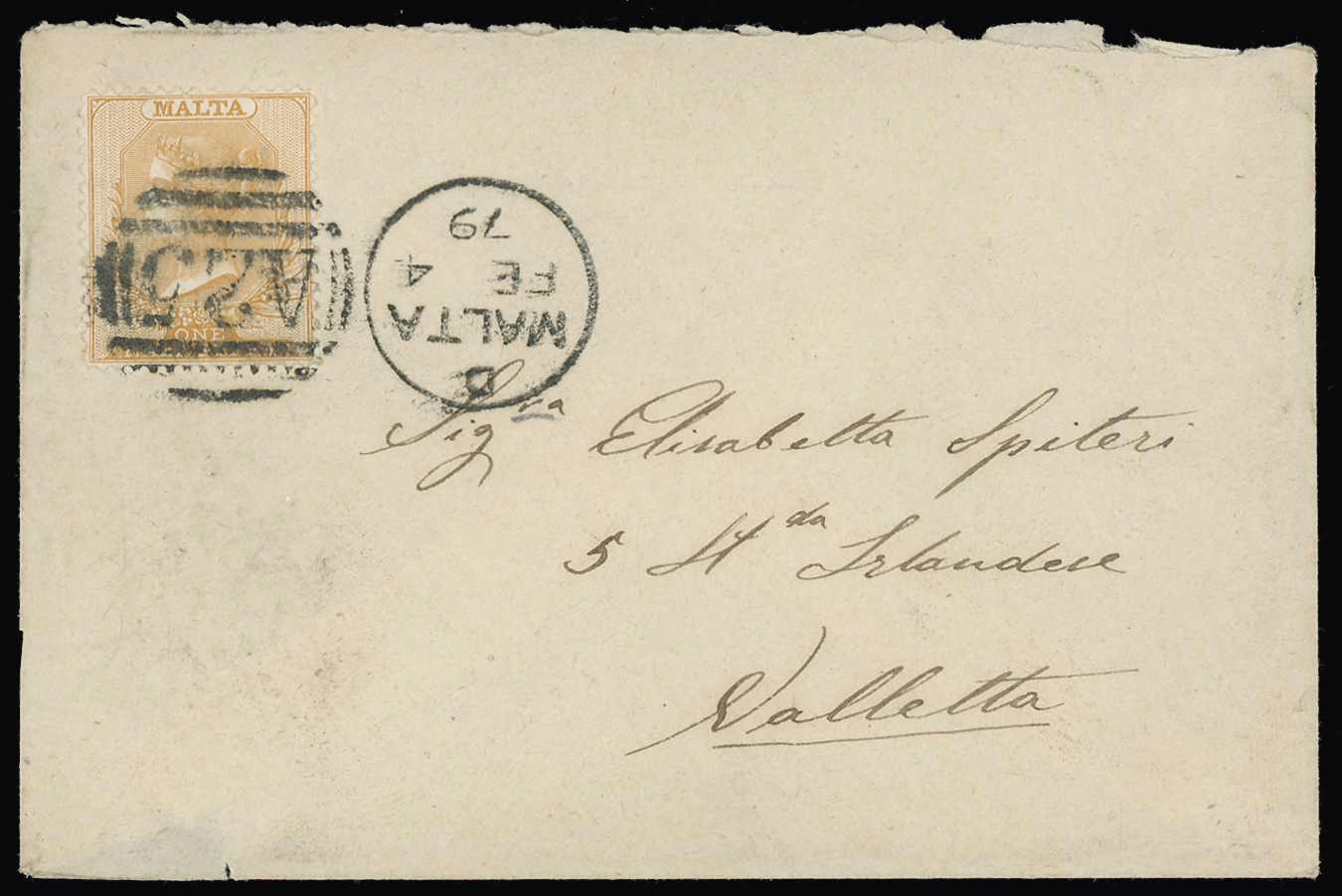 906 c, entire, etc. imageMalta: Issued Stamps: Queen Victoria: 1863-81 Watermark Crown CC, perf. 14 x 121/2 1/2d. buff-yellow, twentieth printing, fine used on 1879 (Feb. 4) cover to Valletta, tied by “A25” duplex. Photo. (Image1)