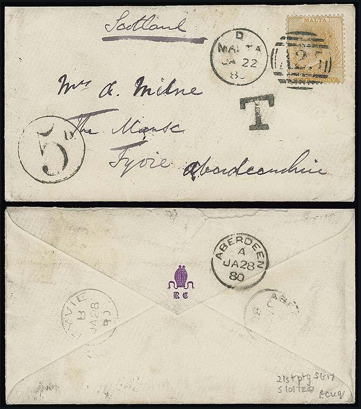 909 c, entire, etc. imageMalta: Issued Stamps: Queen Victoria: 1863-81 Watermark Crown CC, perf. 14 x 121/2 1/2d. orange-yellow, twenty-first printing, used on 1880 (Jan. 22) cover to Aberdeenshire, tied by “A25” duplex, with unframed “T” and “5D” in circle, stamp has been lifted and reaffixed. A rare unauthorised overseas usage. Ex Smith. Photo. (Image1)