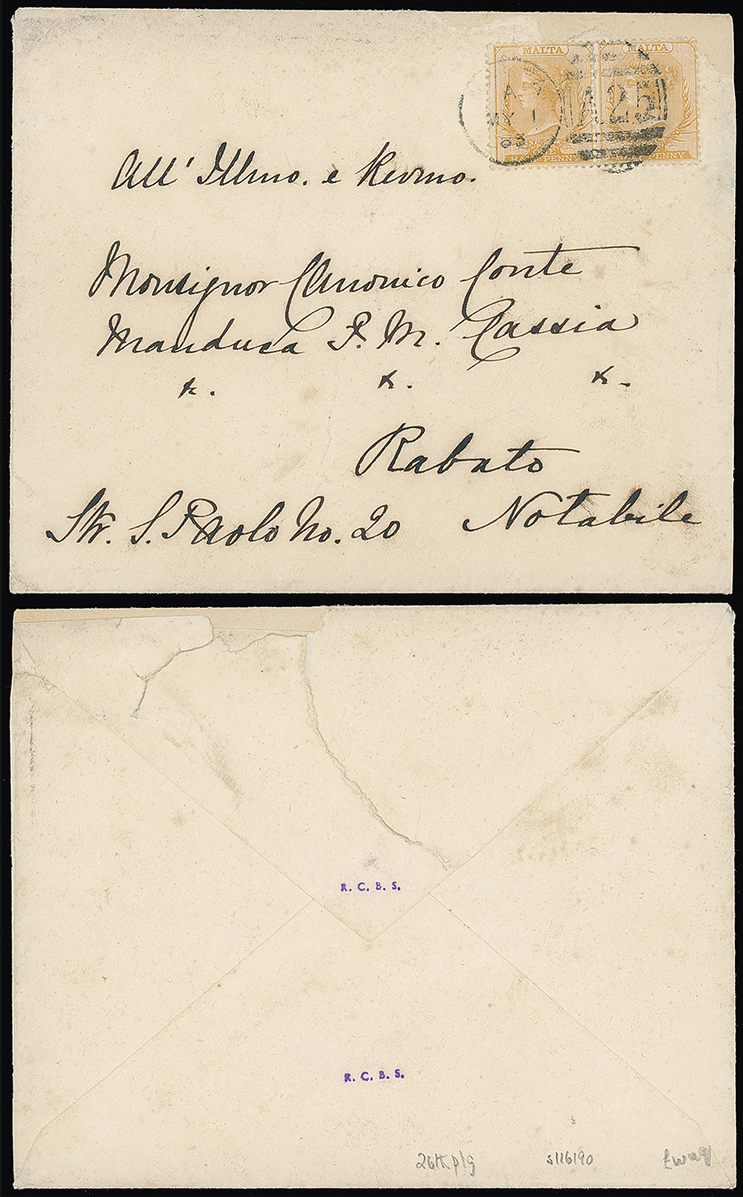 911 c, entire, etc. imageMalta: Issued Stamps: Queen Victoria: 1882-84 Watermark Crown CA perf. 14 1/2d. orange-yellow, twenty-sixth printing, pair used on 1883 (May 1) cover to Rabat, tied by “A25” duplex, pairs are scarce on cover. Ex Smith. Photo. (Image1)