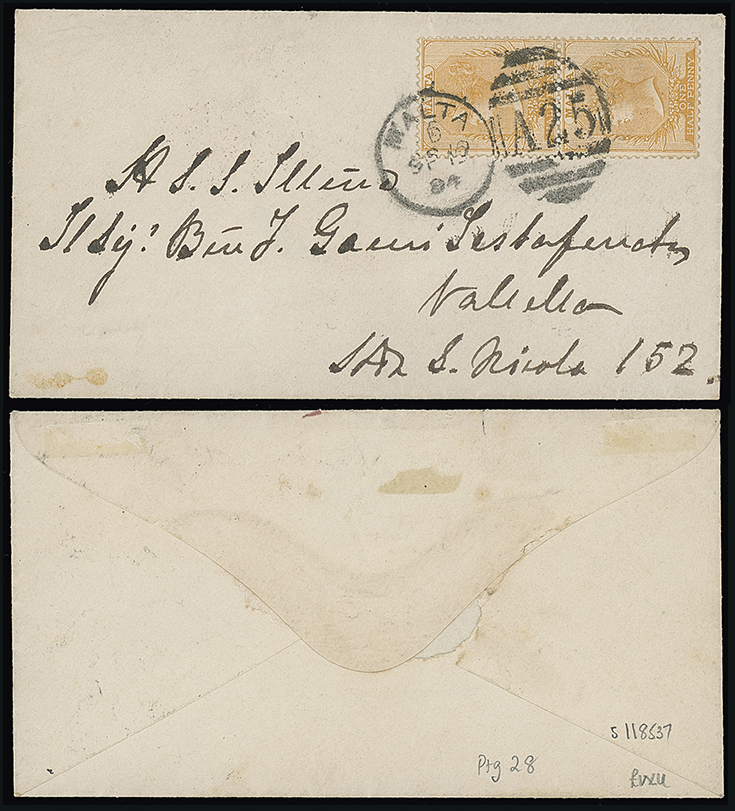 913 c, entire, etc. imageMalta: Issued Stamps: Queen Victoria: 1882-84 Watermark Crown CA perf. 14 1/2d. orange-yellow, twenty-eighth printing, pair used on 1884 (Sept. 10) cover to Valletta, tied by “A25” duplex, pairs are scarce on cover. Photo. (Image1)