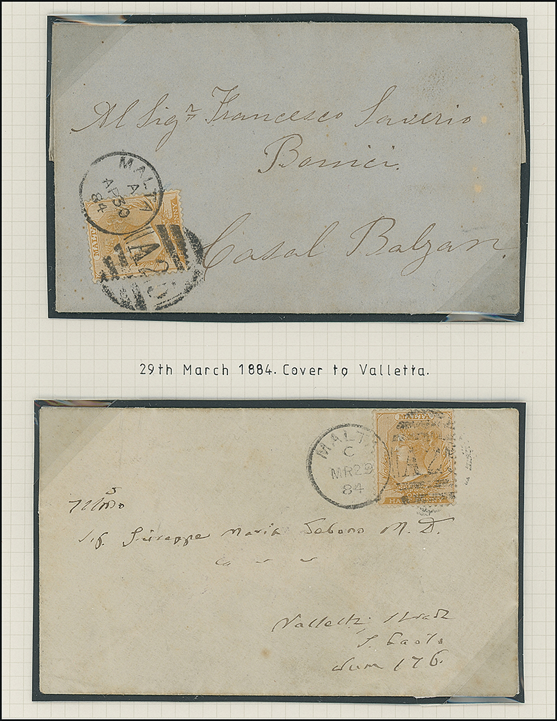914 c, entire, etc. imageMalta: Issued Stamps: Queen Victoria: 1882-84 Watermark Crown CA perf. 14 1/2d. orange-yellow, twenty-eighth printing, two examples used on 1884 (Apr. 30) cover to Belzan and 1884 (Mar. 29) cover to Valletta respectively. (2 items) (Image1)