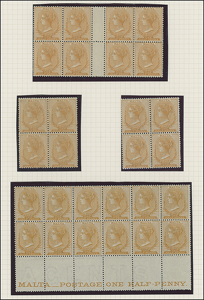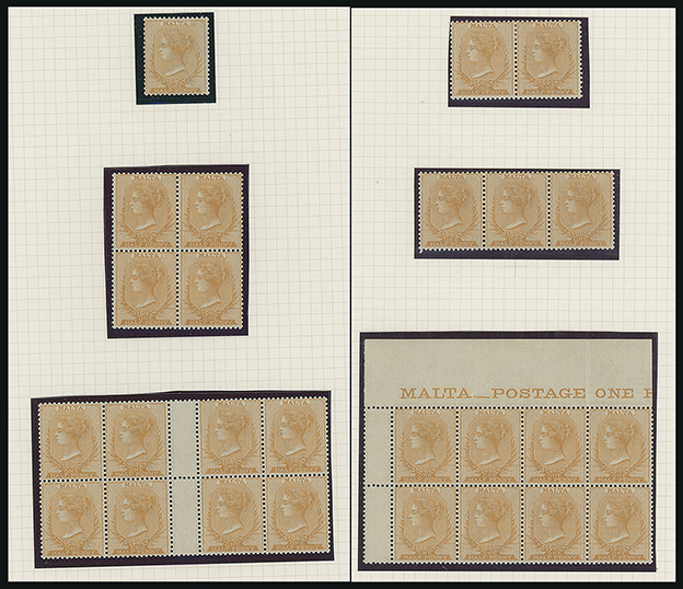 910 nh imageMalta: Issued Stamps: Queen Victoria: 1882-84 Watermark Crown CA perf. 14 1/2d. orange-yellow, twenty-fifth to twenty-eighth printings, mint blocks of twelve, interpanneau block of eight and two blocks of four, mainly fine. (Image1)