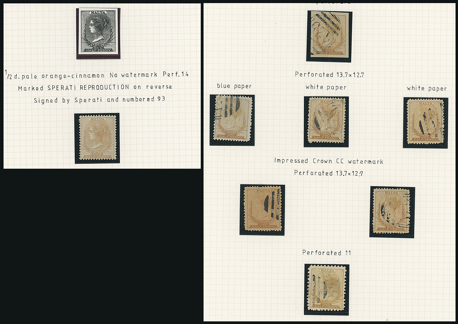 916 imageMalta: Issued Stamps: Queen Victoria: 1860-81 1/2d. forgeries, comprising Sperati photographic print, perforate single stamped “SPERATI REPRODUCTION” on the reverse, also Erasmo Oneglia forgeries. (7) (Image1)