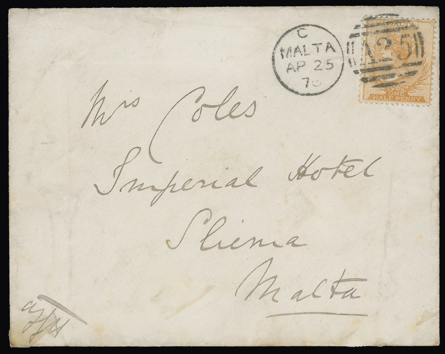 904 c, entire, etc. imageMalta: Issued Stamps: Queen Victoria: 1863-81 Watermark Crown CC, perf. 14 x 121/2: 1/2d. buff-yellow, twentieth printing, fine used on 1878 (Apr. 25) cover to Sliema tied by “A25” duplex, slightly soiled, otherwise fine. Photo. (Image1)