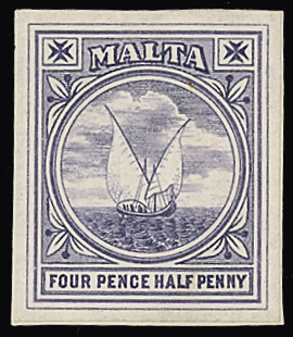 Malta: Issued Stamps: Queen Victoria: 1899-1901, Proofs, 41/2d. printed in lilac on card, fine and fresh. Photo.